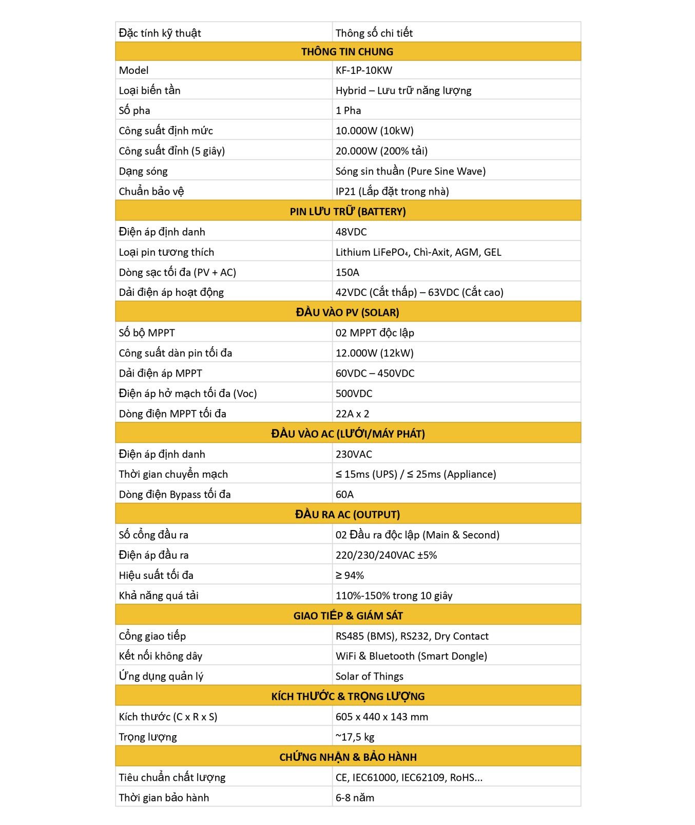 Với công suất 10kW – 1 pha, khả năng vận hành linh hoạt và hỗ trợ đa dạng pin lưu trữ, Kawasan KF-1P-10KW là giải pháp phù hợp cho nhà ở cao cấp, biệt thự, văn phòng, cửa hàng, nhà vườn, trang trại cũng như các khu vực có điện lưới không ổn định hoặc thường xuyên mất điện.