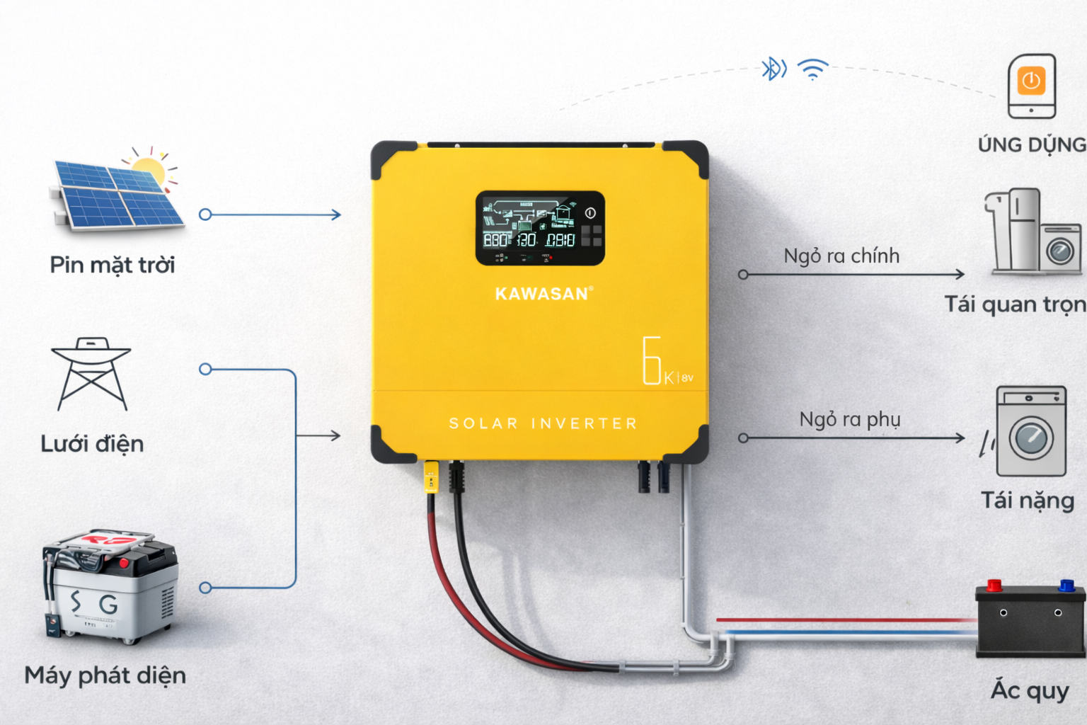 Biến tần Hybrid Kawasan KF54-1P-6KW được trang bị 2 đầu ra AC độc lập: