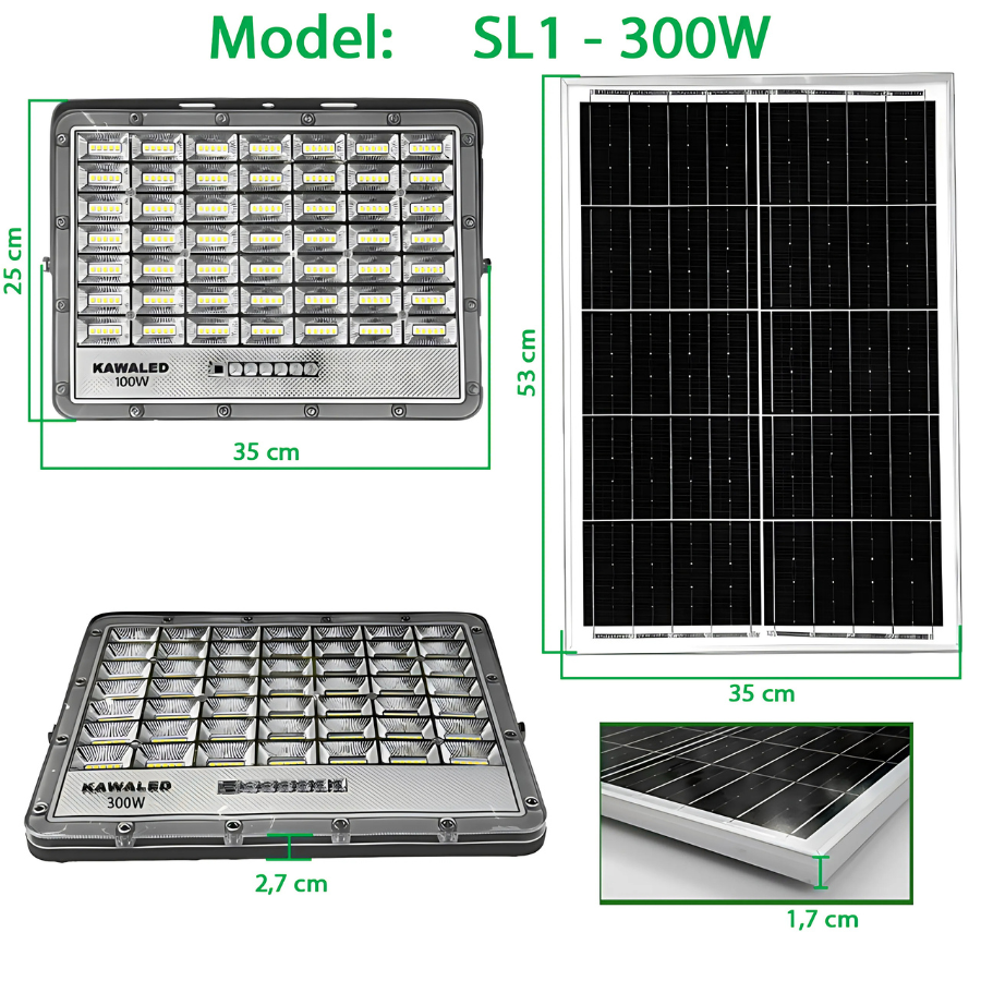 Đèn pha năng lượng mặt trời SL1 công suất 100W – 200W – 300W kết nối pin chính xác